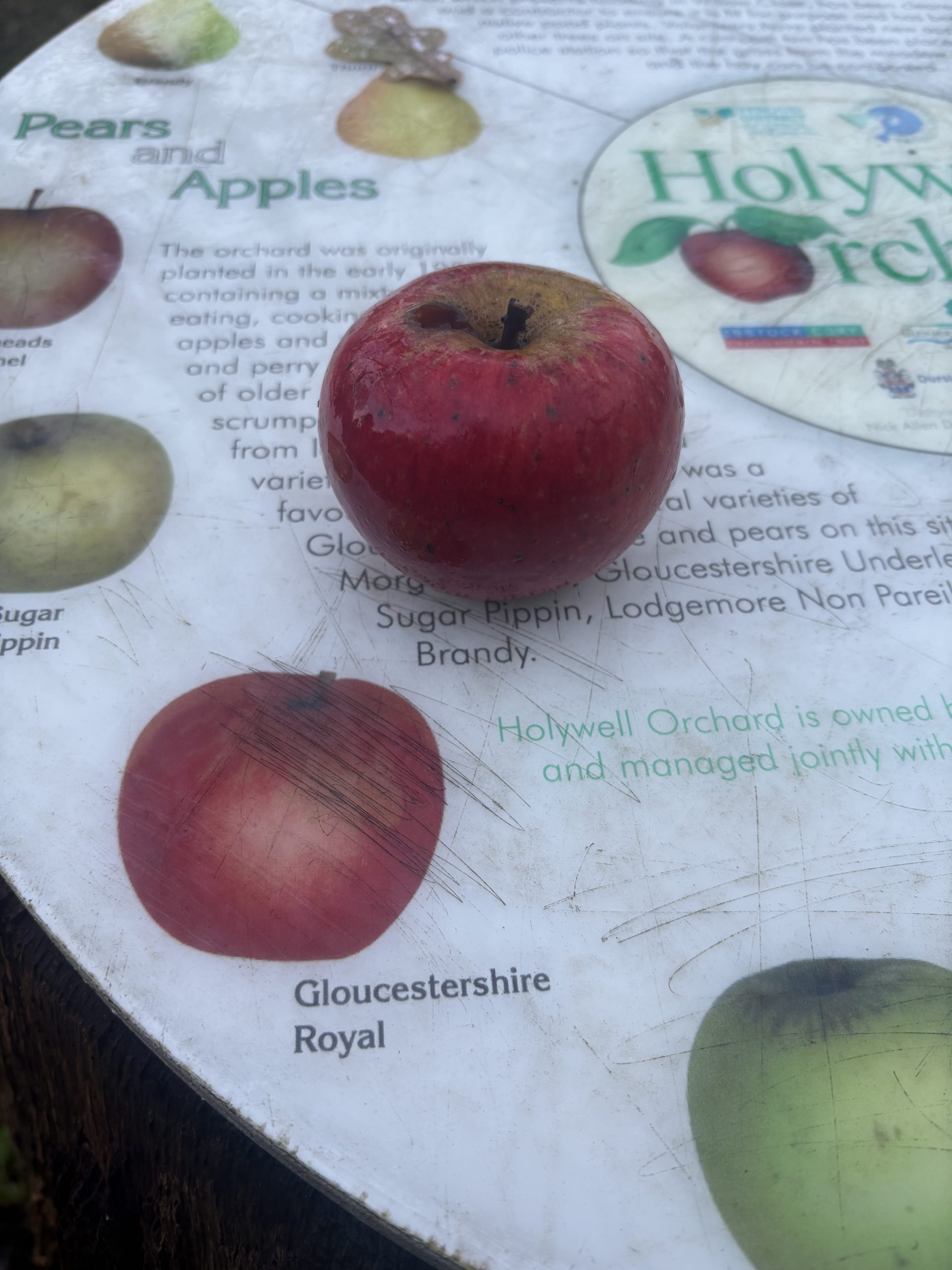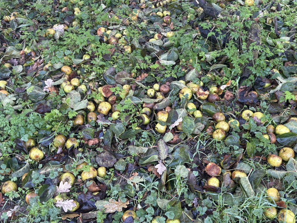 As for the orchard, some of the trees still remain, now perhaps a hundred or so years old. Some of their varieties have been identified, there’s an information board about them in the orchard as work was done here a few years ago by Stroud Valleys Project and the District Council. This has been a good year for fruit, but very little is collected from these trees. As we went down the steps to where a large pear tree stood that rich autumnal scent of sweet, rotting fruit filled the air. These are more trees in our area that are worth nurturing and preserving.