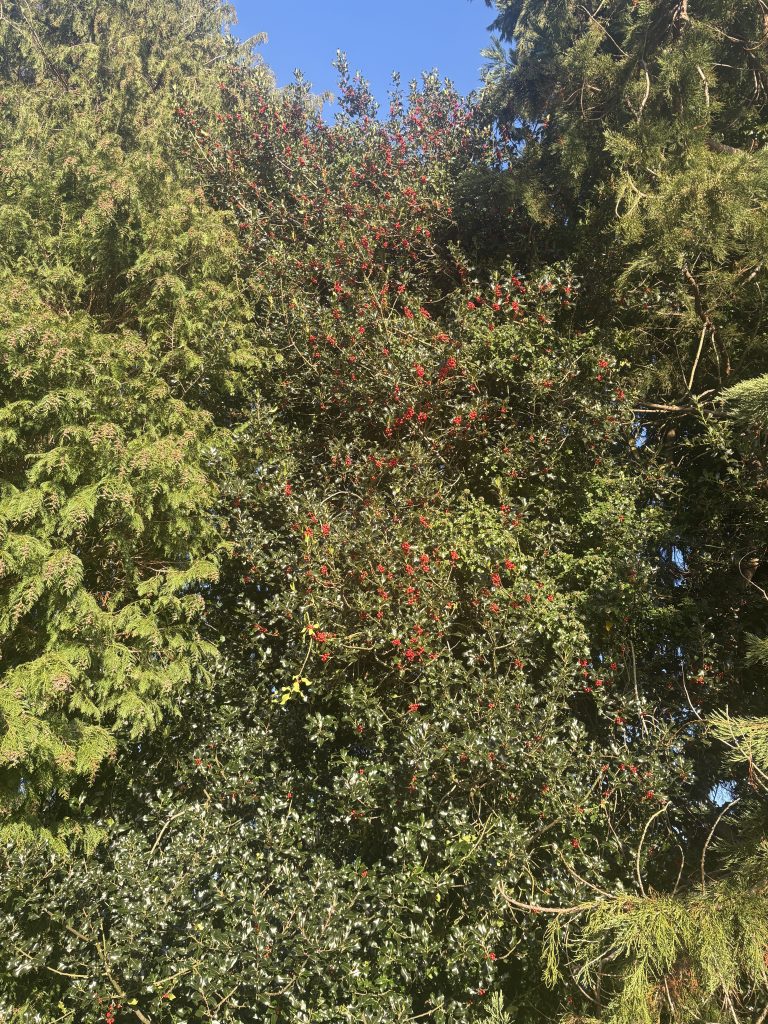 Having met at the tall pine trees outside the police station on Dursley Road, we didn’t need to move far to find copious examples of fantastically berried holly, different forms of ivy and many other firs and conifers.