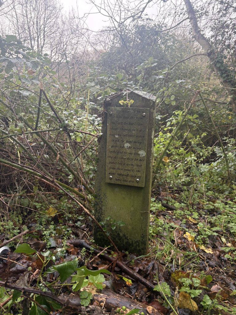 History relates that a nun would daily come in silence with her bowl to collect water from the spring that naturally emerges from the hillside here. So it became known as Holywell. In time, a cottage was built nearby and an orchard planted. Hence, Holywell Orchard. Many others have relied on that spring for their supplies of fresh water, but only a few documented, you’ll find other stories if you visit the spot.